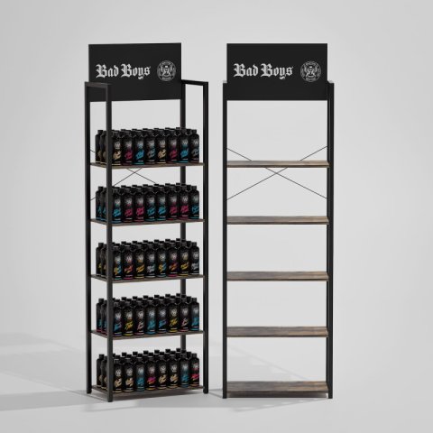 Ale nejde jen o praktičnost, tenhle regál i skvěle vypadá. S jeho drsným designem a logem Bad Boys se dokonale hodí do jakéhokoliv prostoru nebo prodejny.