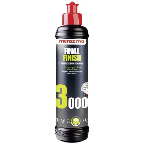 Menzerna Super Finish 3000 je finišovací leštící pasta, kterou ukončujeme leštění. Má jen minimální úběr laku, dokonale vyleští povrch do zrcadlového lesku a připraví pro nanášení vosku. Odstraní zamlžení po hrubších pastách, mikroškrábance a hologramy.