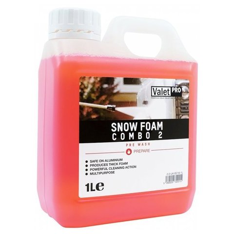 ValetPro Snow Foam Combo2 1L je vysoce pěnivá, alkalická mycí pěna pro předmytí automobylů či motocyklů.