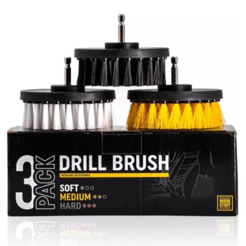 Work Stuff Drill Brush 3-pack je sada tvrdého, středního a měkkého čistícího kartáče na interiér pro upevnění do vrtačky.